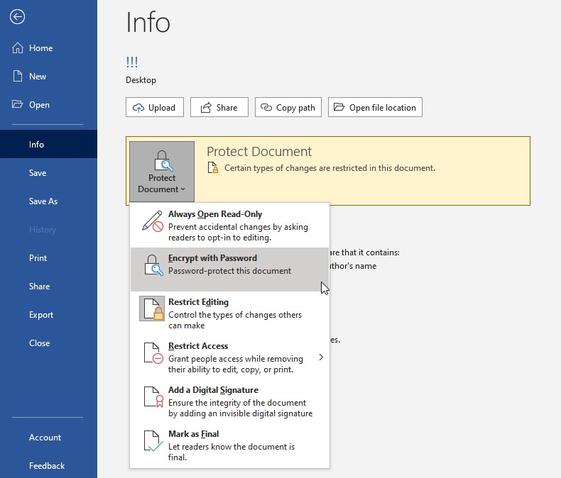b.导航到文件>信息>保护文档(或在 Microsoft Excel 中保护工作簿,在 PowerPoint 中保护演示文稿)。