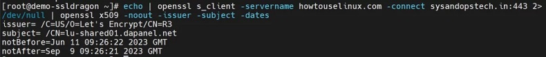 $ echo | openssl s_client -servername howtouselinux.com -connect yourplc.com:443 2>/dev/null | openssl x509 -noout -issuer -subject -dates