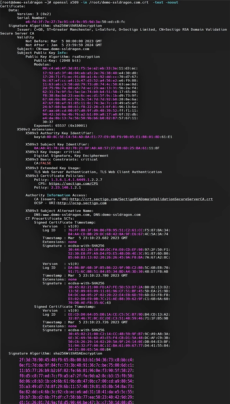 OpenSSL 提供了丰富的命令来生成、安装和管理证书。要检查特定证书的详细信息,请运行以下命令: