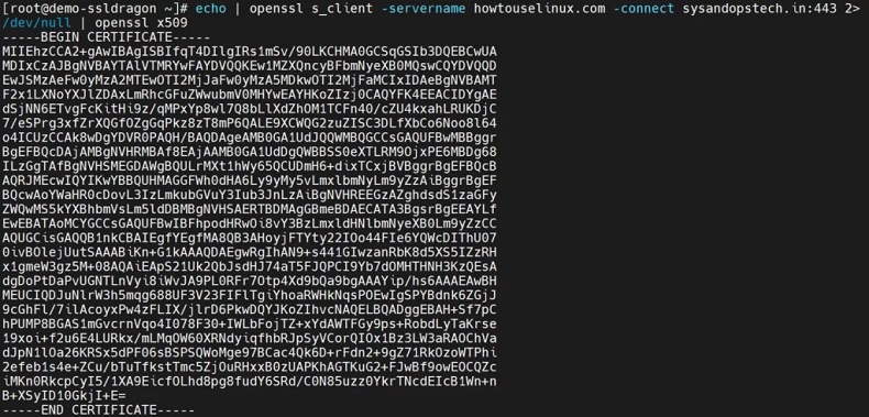 $ echo | openssl s_client -servername howtouselinux.com -connect yourplc.com:443 2>/dev/null | openssl x509