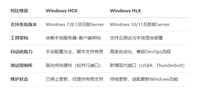 HCK环境搭建复杂,且微软已不再提供技术更新。HLK支持未来系统升级,更适合长期迭代的产品。