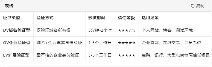在正式启动申请流程前,科学选型是第一步。错误的选择可能导致成本浪费或安全级别不足。HTTPS证书主要分为两大维度:验证等级和域名覆盖范围。