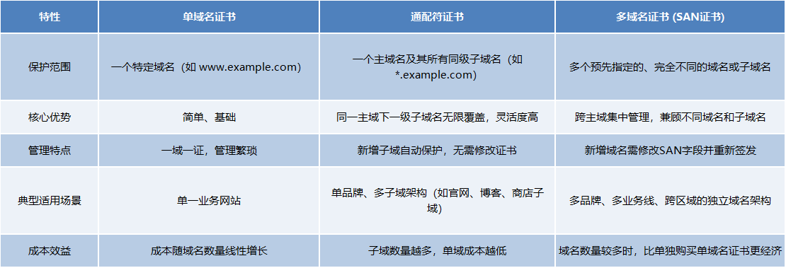 对于企业而言,这意味着无论您拥有3个、30个还是更多域名,只需要管理一张证书即可,极大地简化了证书架构。