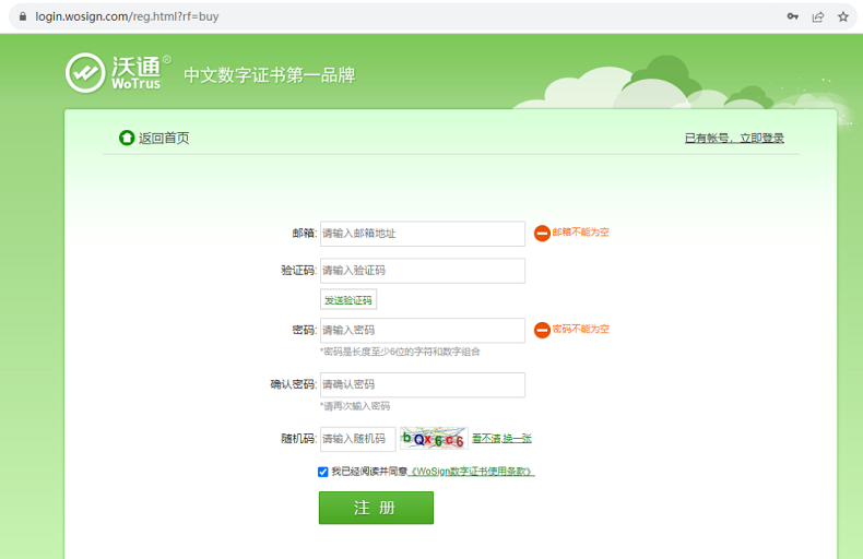 提交注册信息:打开 https://buy.wosign.com站点,如下图所示;填写邮箱、登录密码、确认密码、验证码等。点“注册”按钮,提交注册信息。