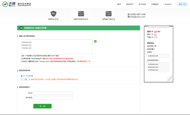 注册沃通数字证书商店账号后,可直接在线下单购买SSL证书,下单过程中,填写证书绑定域名、申请年限等信息。如下图: