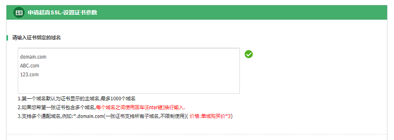 3.通配域名:您有多个顶级域名相同的子域名需要使用SSL证书(如:A.domain.com、B.domain.com、C.domain.com等通配符域名),直接在域名填写框内输入一个通配符域名。