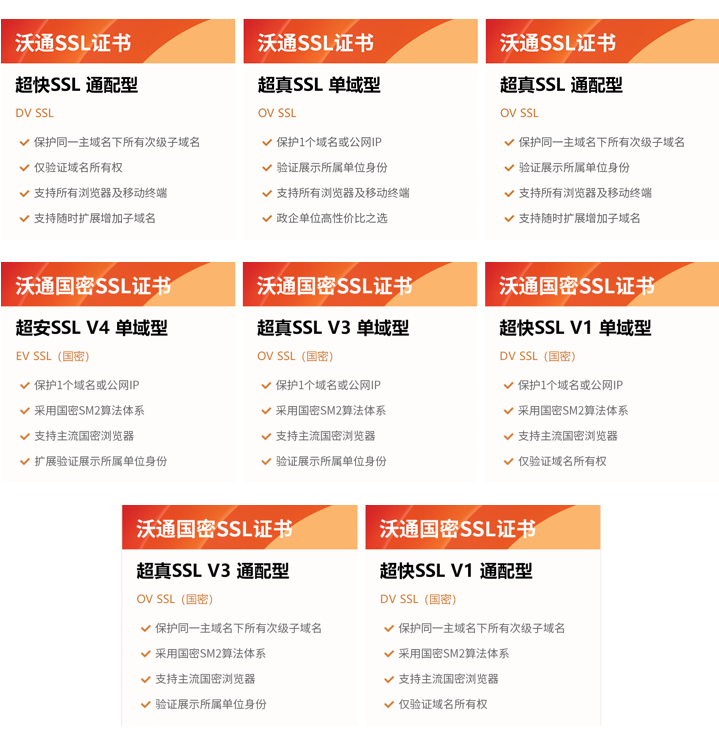 1、沃通SSL证书推出多款单域名SSL证书、通配符SSL证书优惠,其中特别推荐超真SSL通配型证书,政企单位选用超真SSL通配型证书,不仅实现HTTPS传输加密,同时验证展示单位可信身份,让网站更加安全可信,活动期间好价力荐。